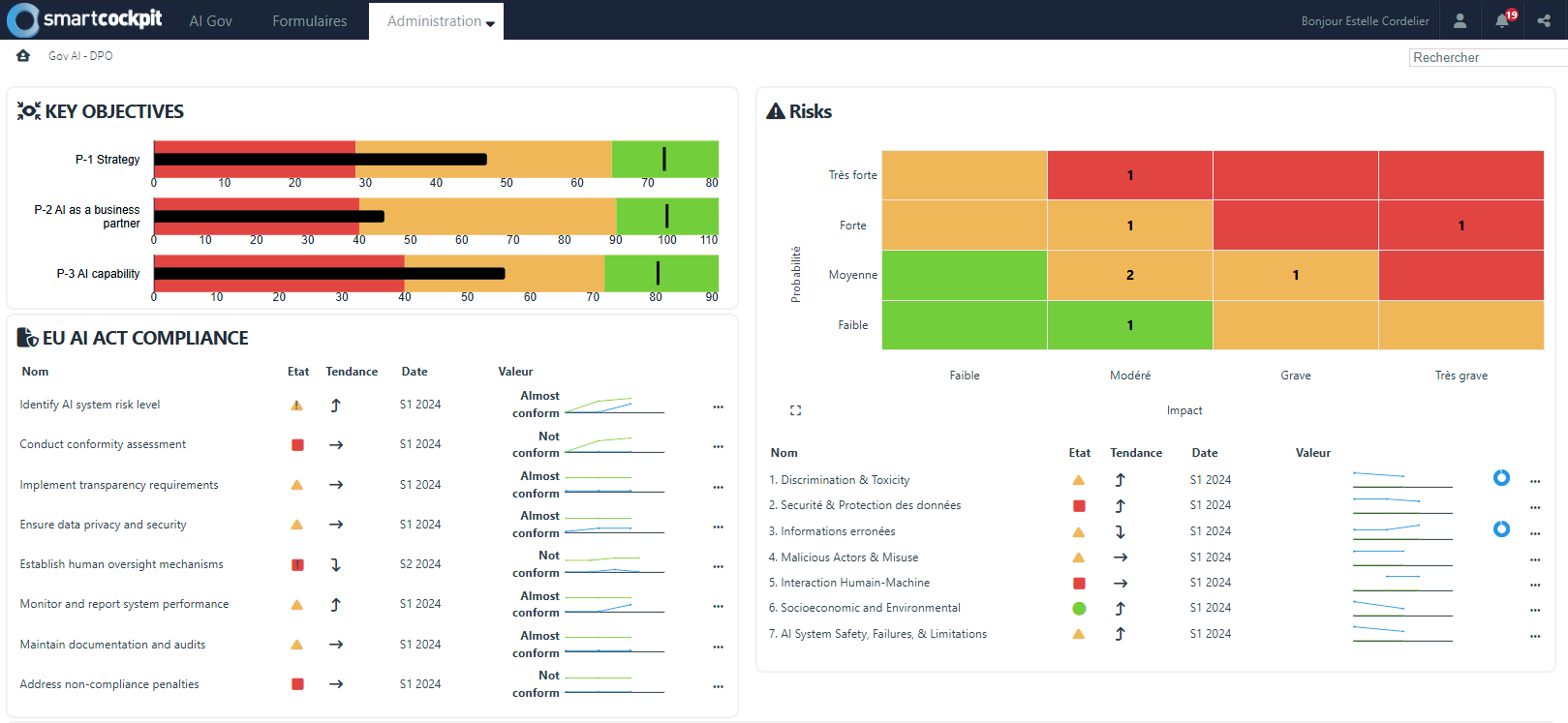 Le premier point que nous aborderions dans la gouvernance est la transparence des décisions de l’IA sur le taux de réductions, on pourrait donc mesurer le nombre de consultation du justificatif du taux de réduction. Nous intégrerions également dans le cockpit le suivi des biais potentiels qu’il soit voulu ou non, avec le taux de disparité (par type de produit, enseigne ou lieu géographique). Afin d’avoir une vision complète nous suivrions aussi la réactivité de l’IA aux nouvelles réglementations sur le marché de l’alimentaire. Et enfin, il nous semblerait important de suivre les interventions humaines, pour s’assurer que l’IA n’est pas seule partie prenante dans les décisions critiques (taux de décisions ajustées, taux de validation humaine des suggestions, etc).
